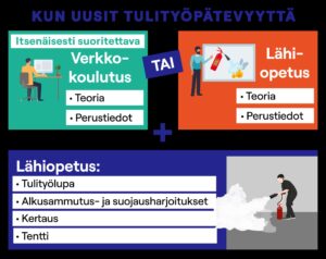 Tulityökorttikoulutus on yhden päivän intensiivikoulutus, joka sisältää sekä teoriaa että käytännön harjoituksia. Päivän aikana käydään läpi: